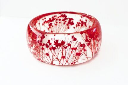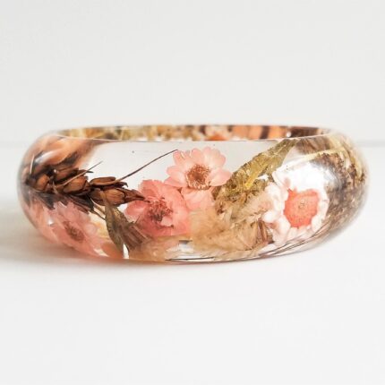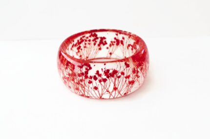 Real pressed flower ring, featuring yellow baby’s breath, white Queen Anne’s Lace flowers and turquoise blossoms. The ring has an oval shape and it is approximately .70″ x .98″(18x25mm.) Brass base.