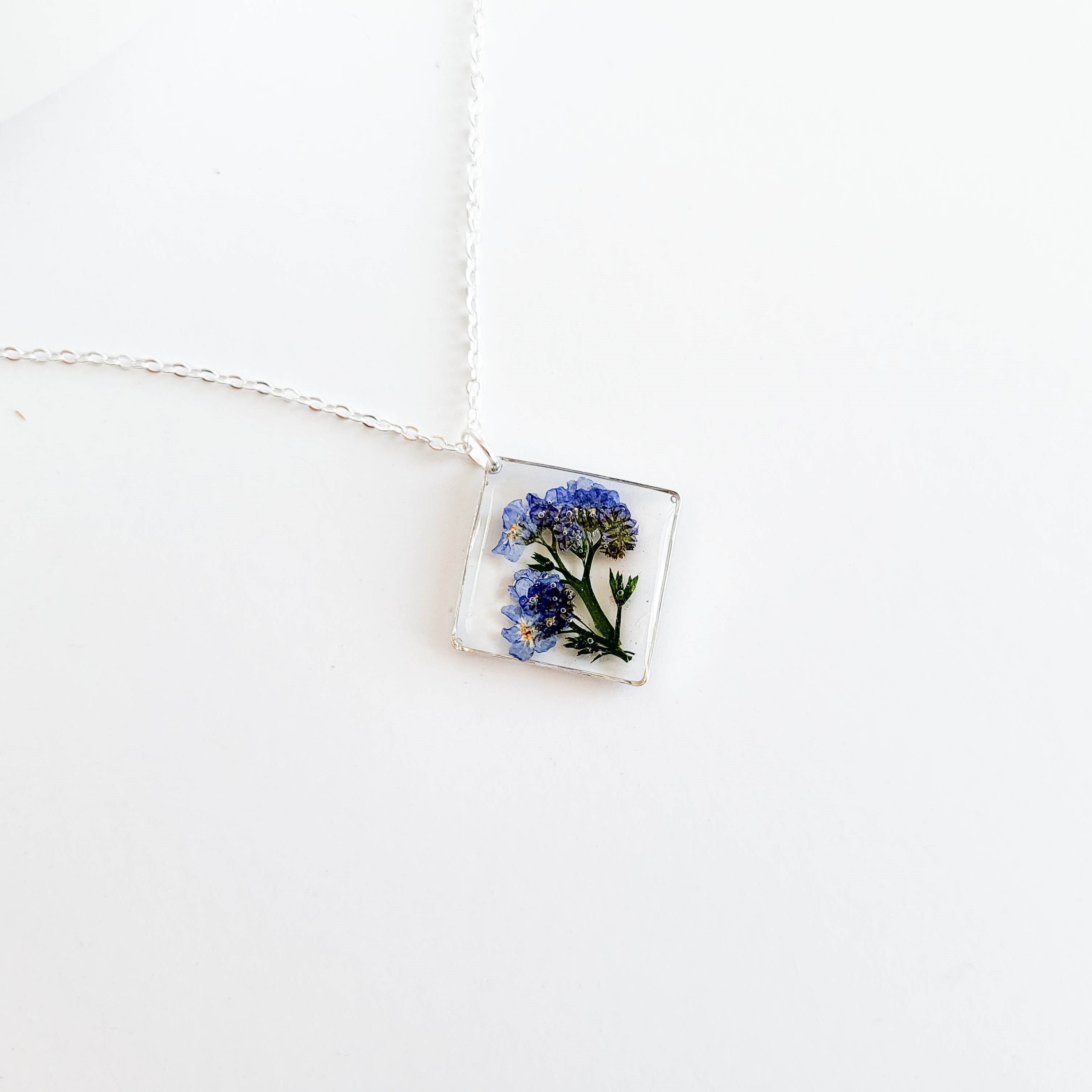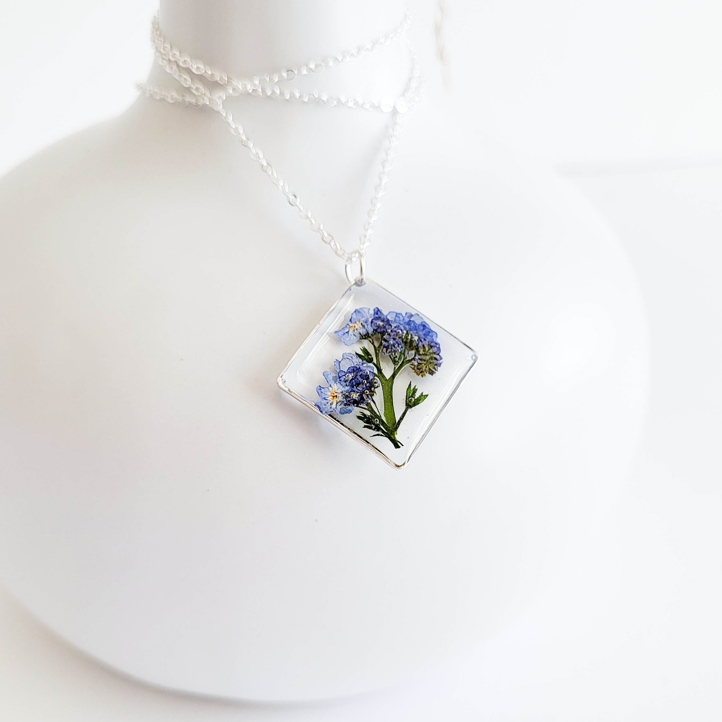 Real Forget me nots flower necklace, preserved in clear jeweler’s grade resin. Available in silver/gold plated. Chain measures approximately 18″ in length. Pendant measures approximately 3/4″ x 3/4″