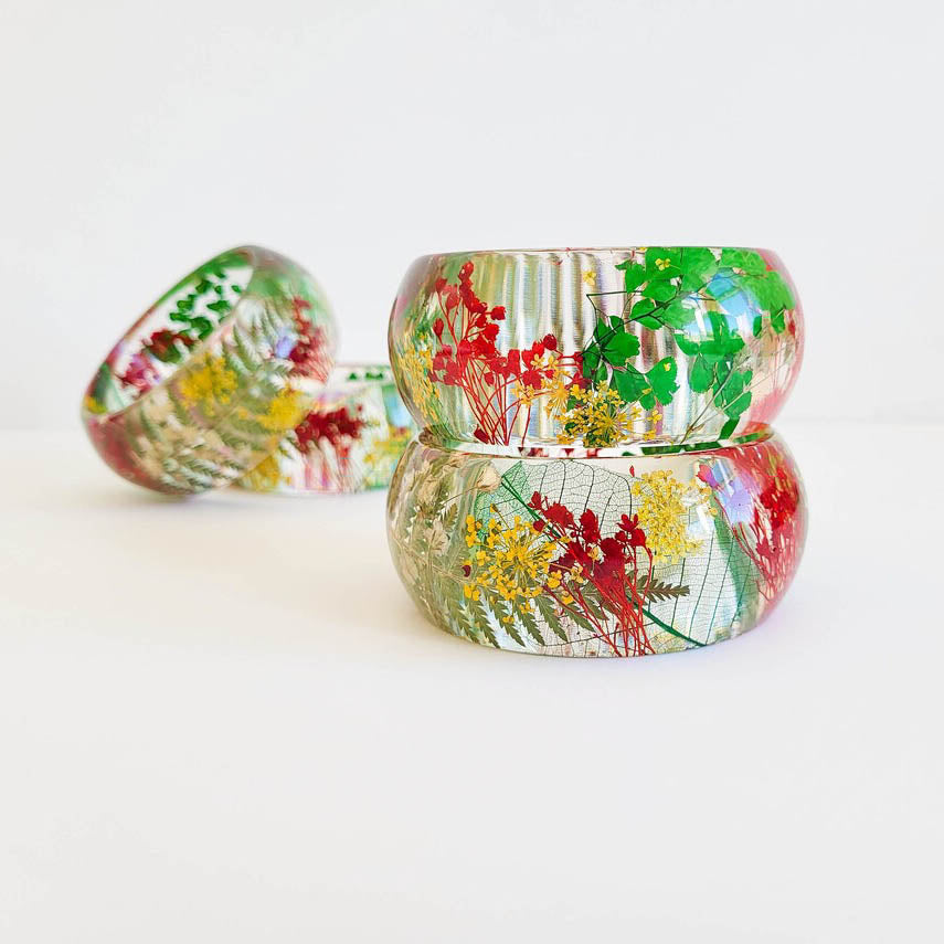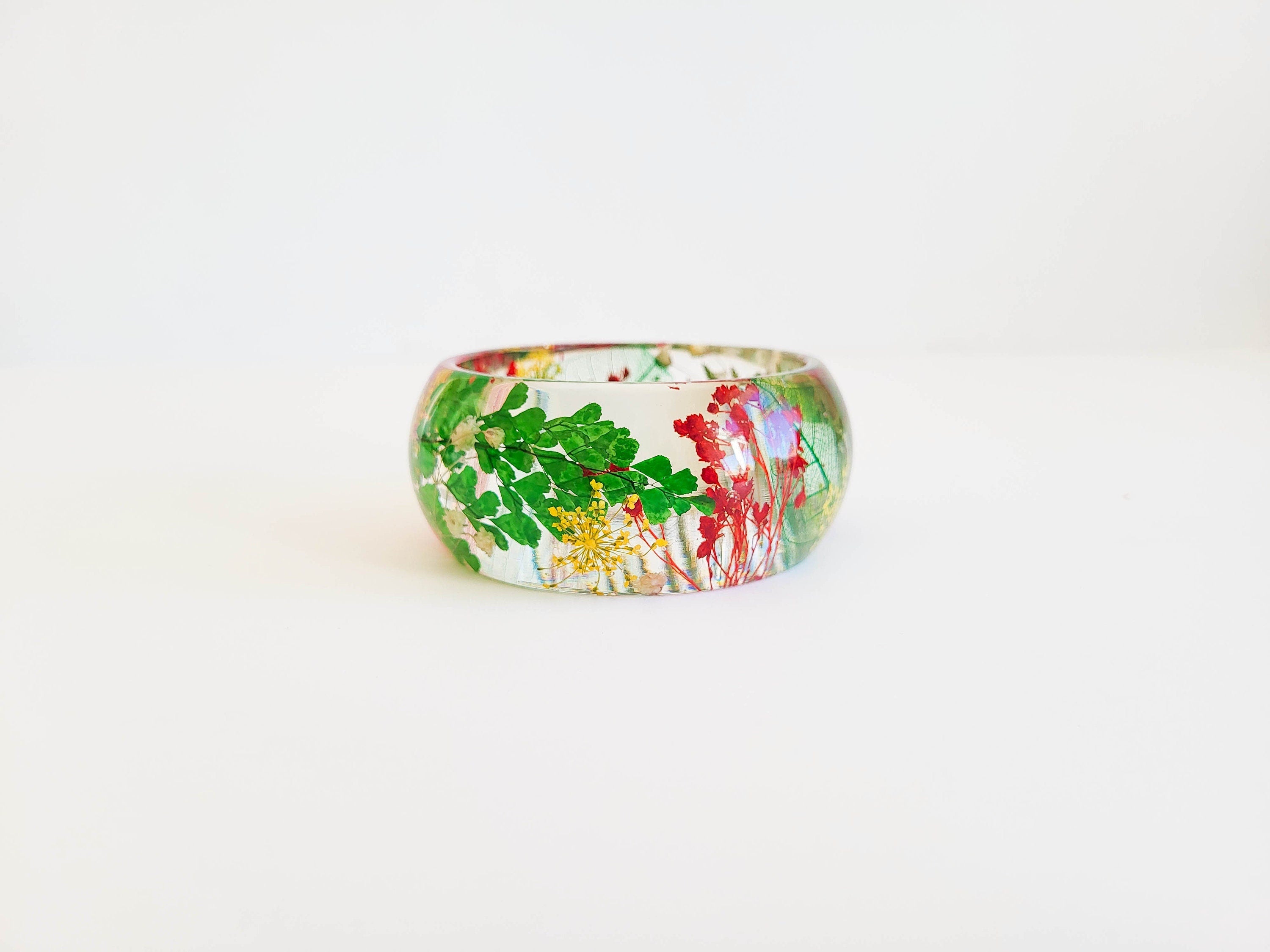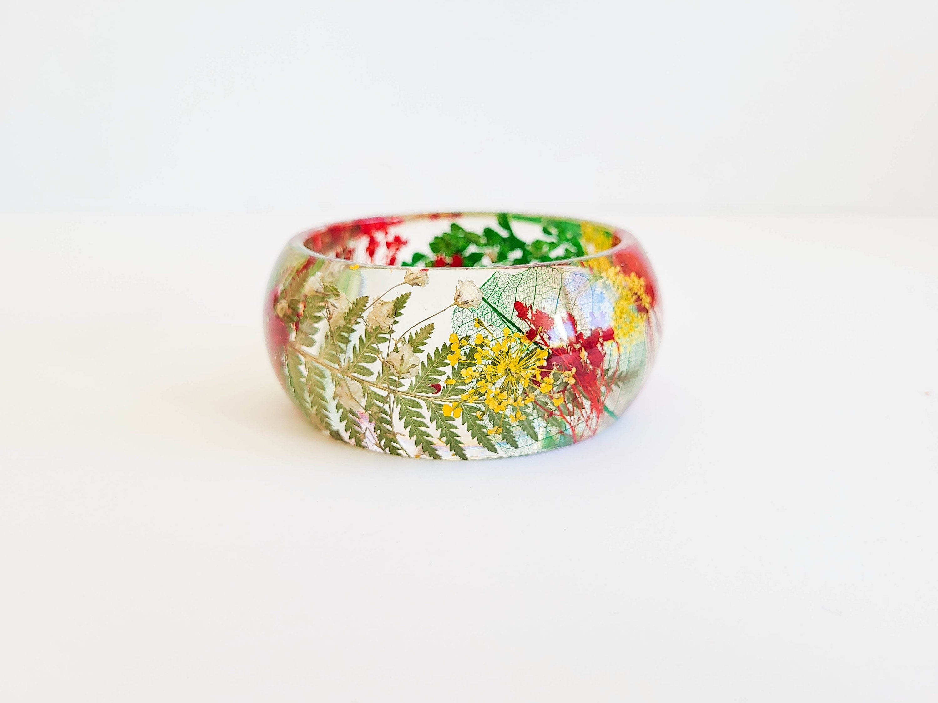 Real pressed flower resin bangle. The bangle features yellow Queen Anne’s lace flower, red and white baby’s breath, green skeleton leaves, and ferns. The bangle is made with jeweler’s grade resin. The opening/diameter is 2.4″ (62mm) – circonference 7.5″ (190mm). The height of the bracelet is approximately 1.25″.