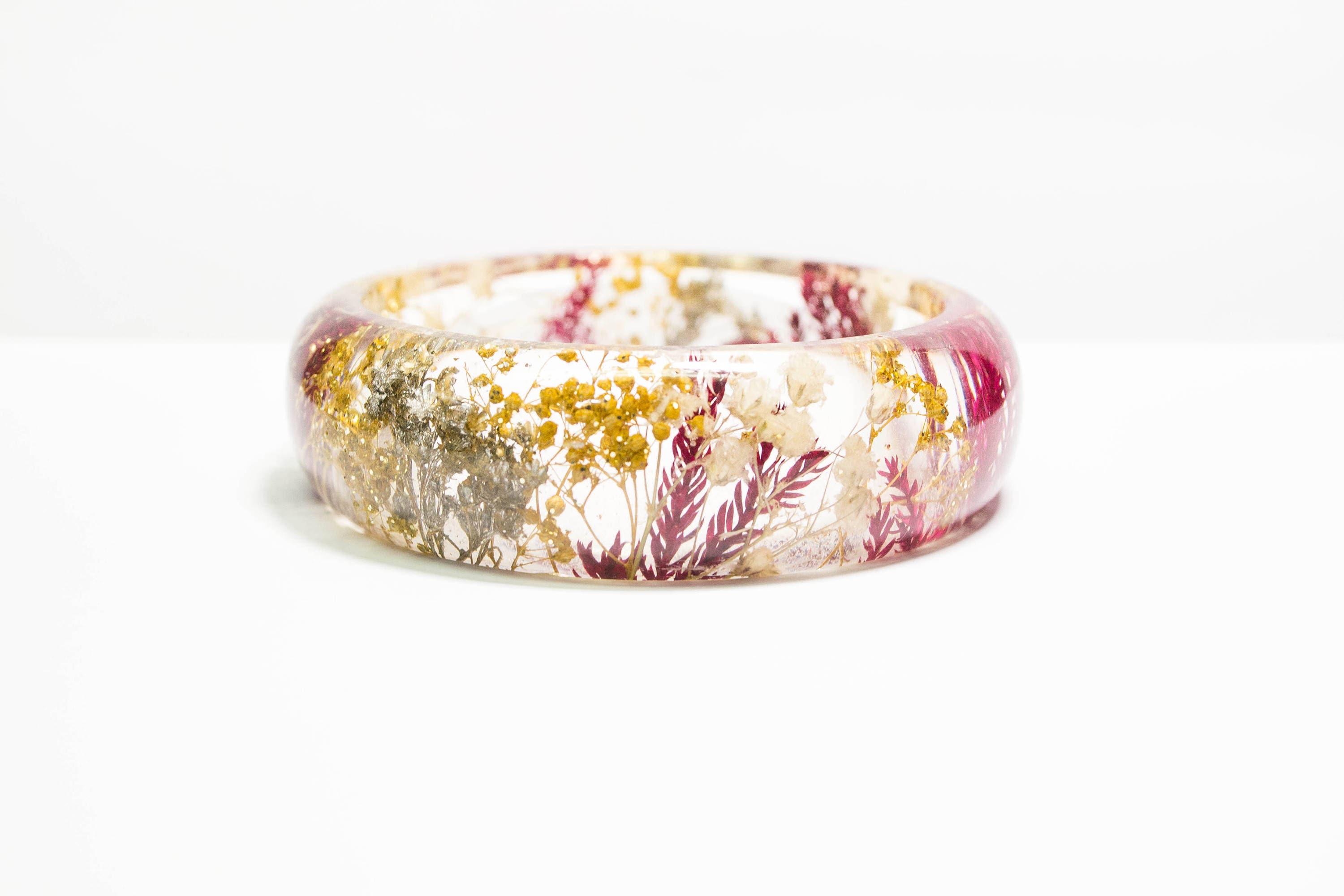 Stunning real flower bracelet featuring red pine, white, gold and silver Baby’s Breath flowers. The tiny Baby’s Breath flowers are a symbol of everlasting love, pureness and innocence. This bracelet makes a unique Christmas gift. The bracelet is handcrafted from start to finish, and it is made with crystal clear jeweler’s grade resin that captures the beauty and details of each flower. This nature bracelet makes a unique and wonderful gift.