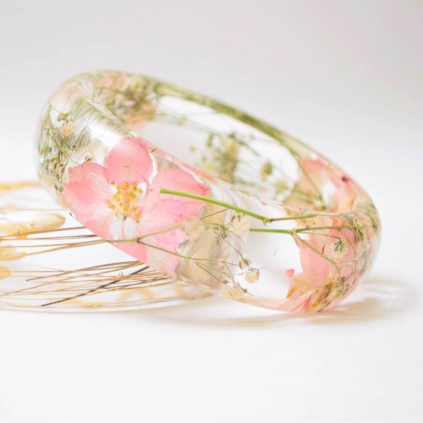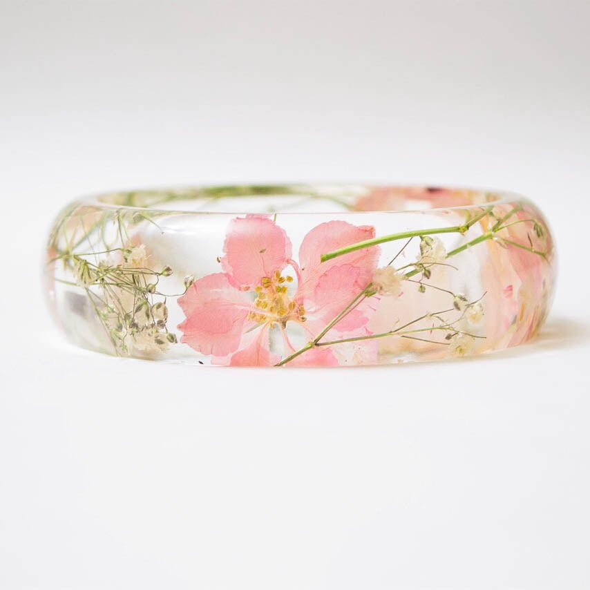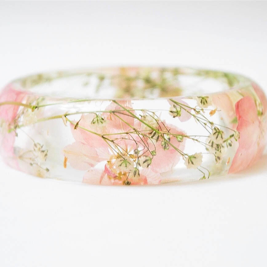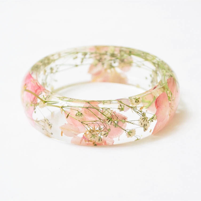 Real flower resin bangle. The bangle features soft pink/blush colored larkspur flowers with white baby’s breath flowers.