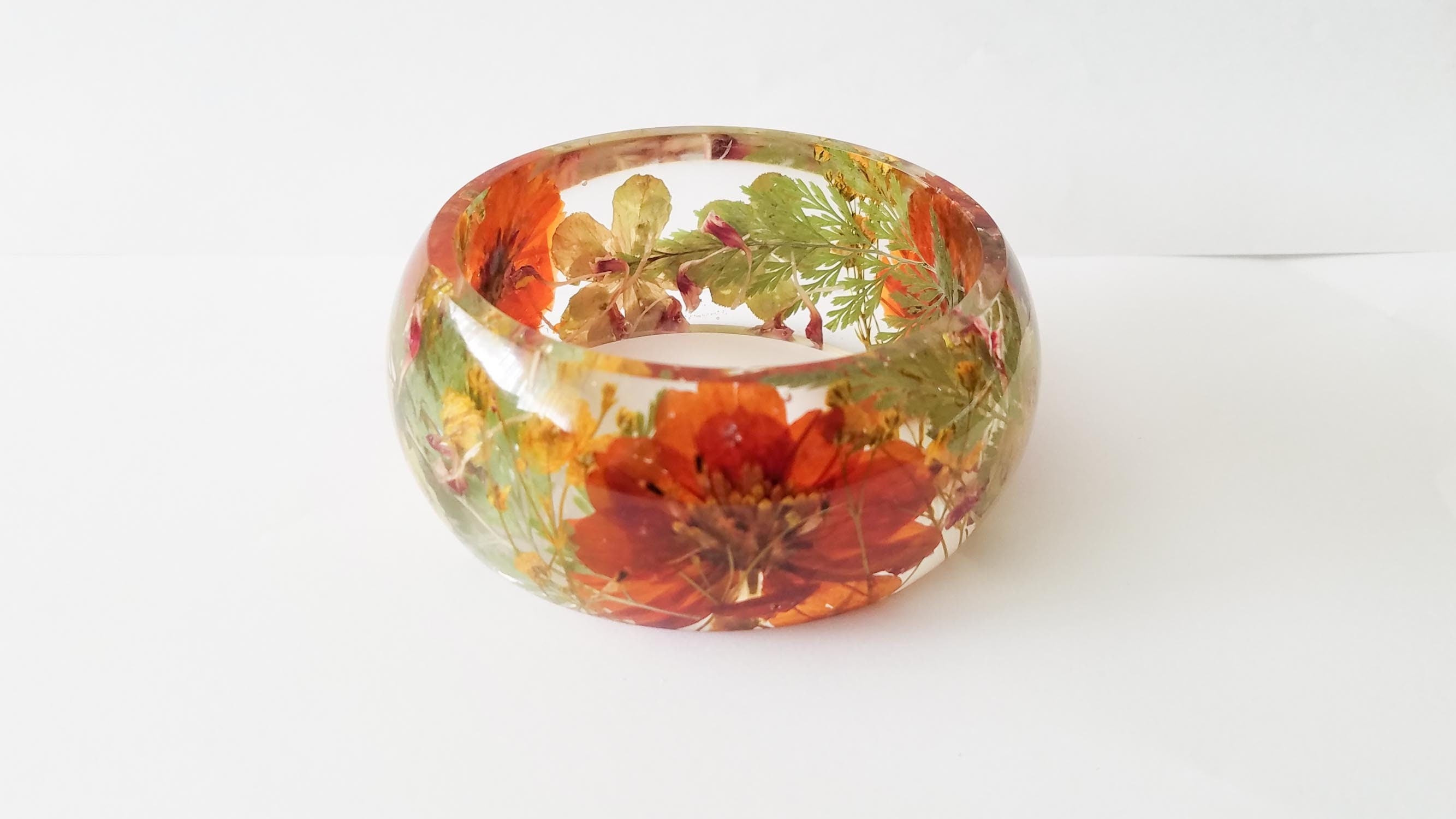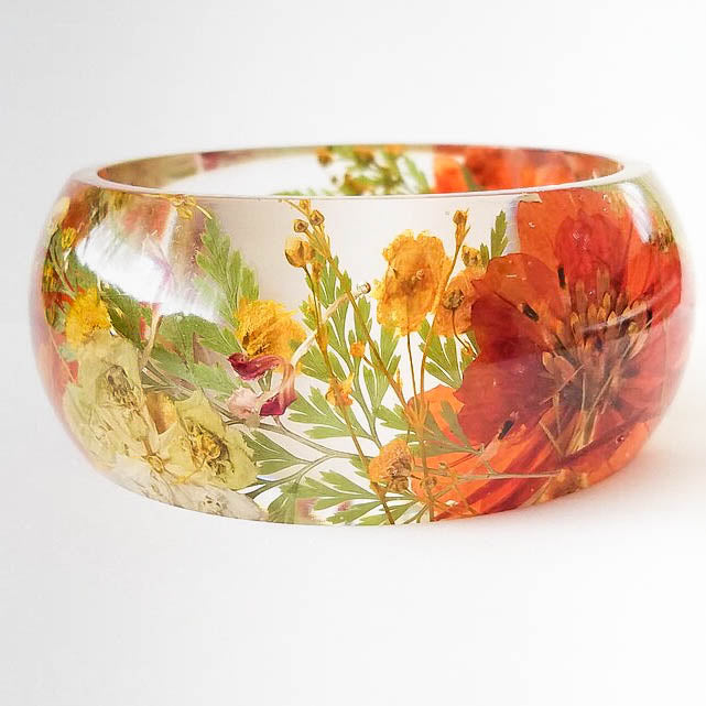 Real pressed flower bracelet. The bracelet features orange, green flowers, yellow baby’s breath and ferns. The opening/diameter is 2.4″ (62mm) – circumference 7.5″ (190mm). The height of the bracelet is approximately 1.25″.