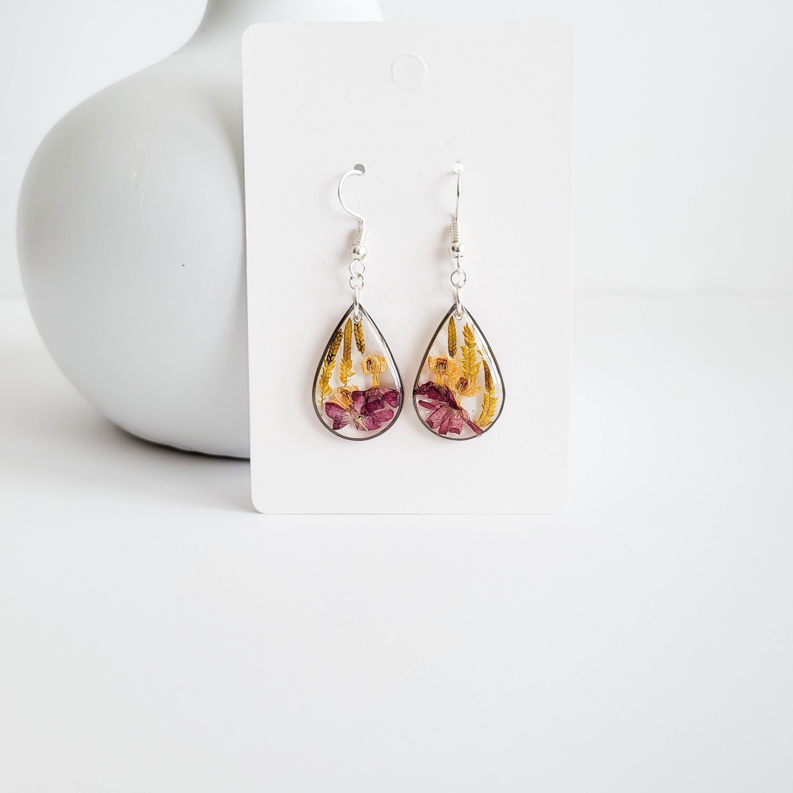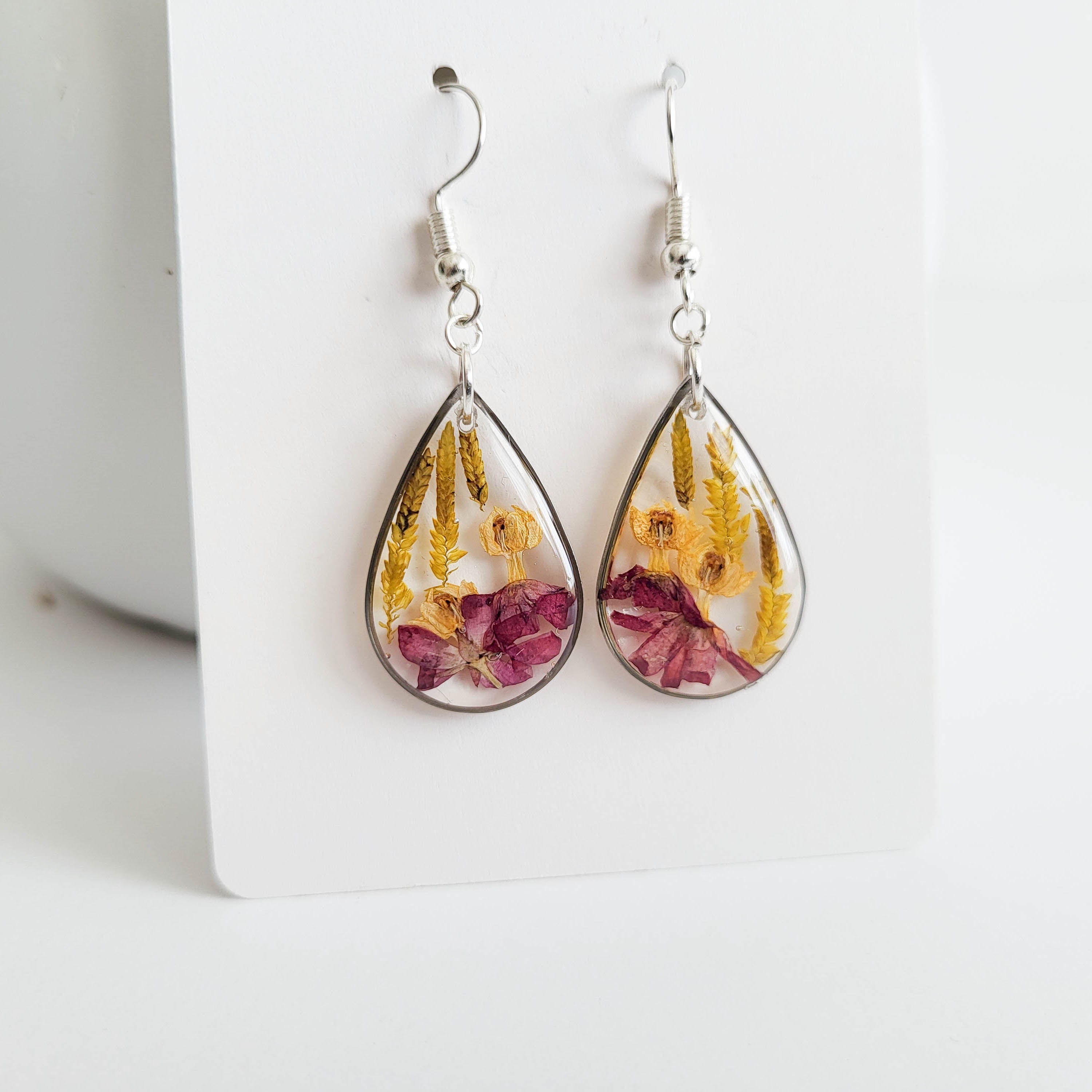 Real pressed flower earrings. Flowers are preserved in clear jeweler’s grade resin. The shape of the earrings is teardrop and they measure approximately .5″ x 1″ (12.7×25.4mm.) Ear wires are silver plated.