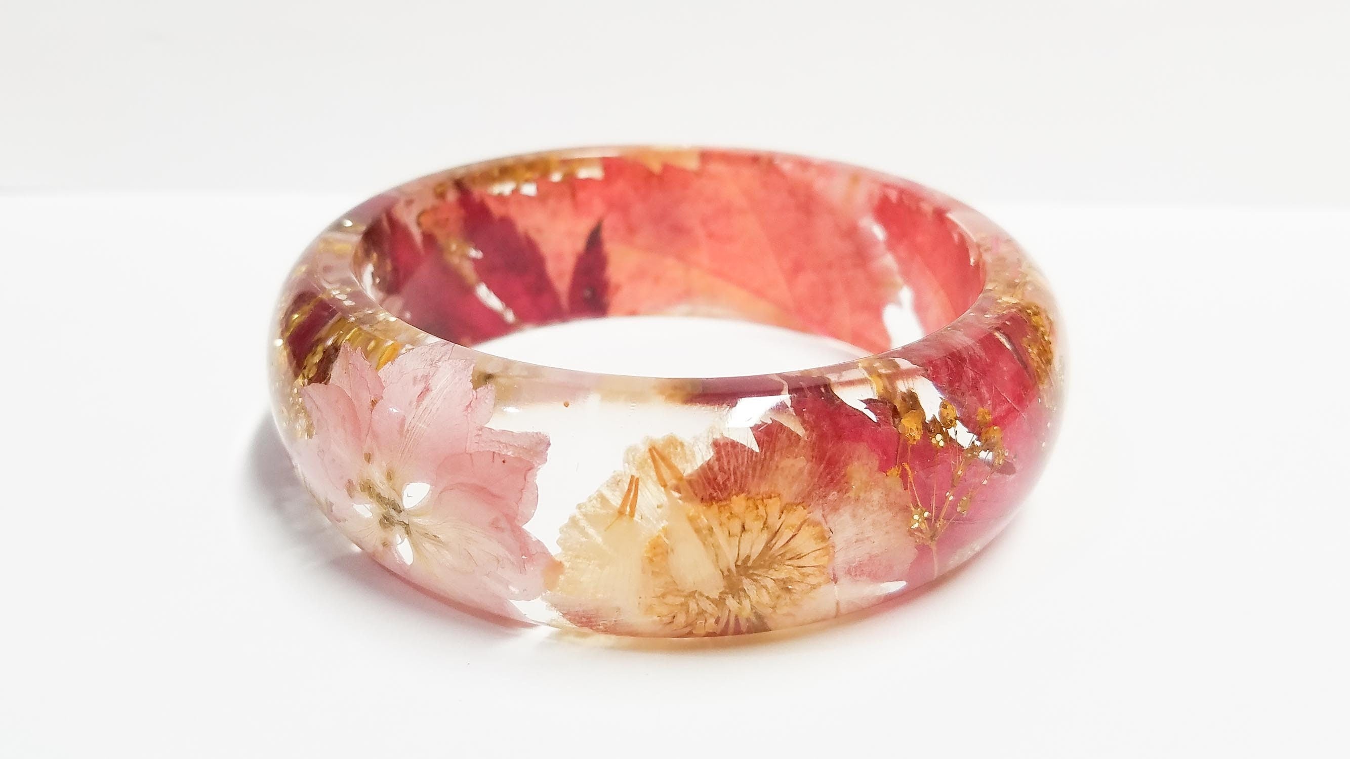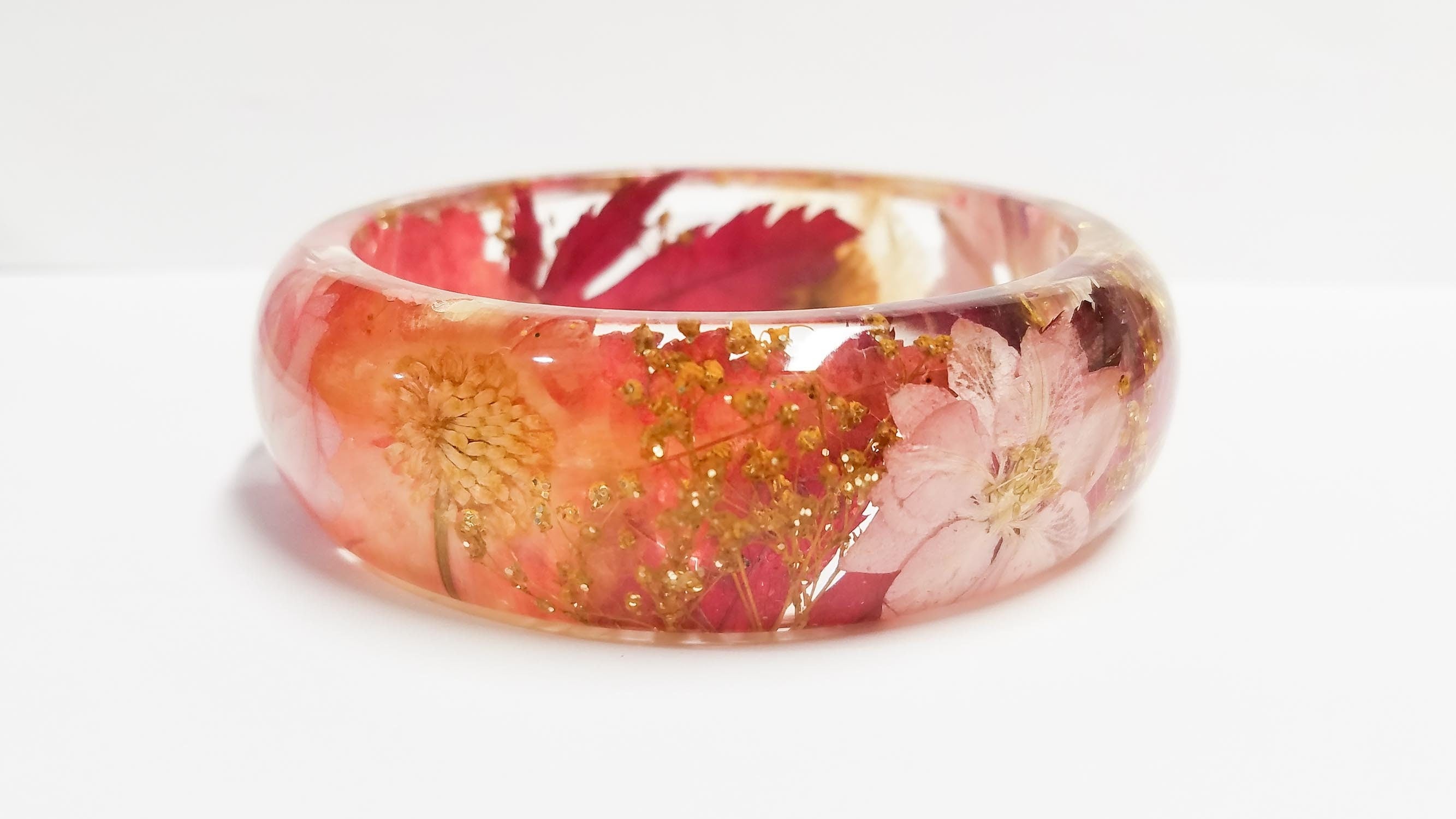 Real flower resin bracelet. This bangle features pressed leaves and florals, such as pink Larkspur, gold Baby’s Breath and
