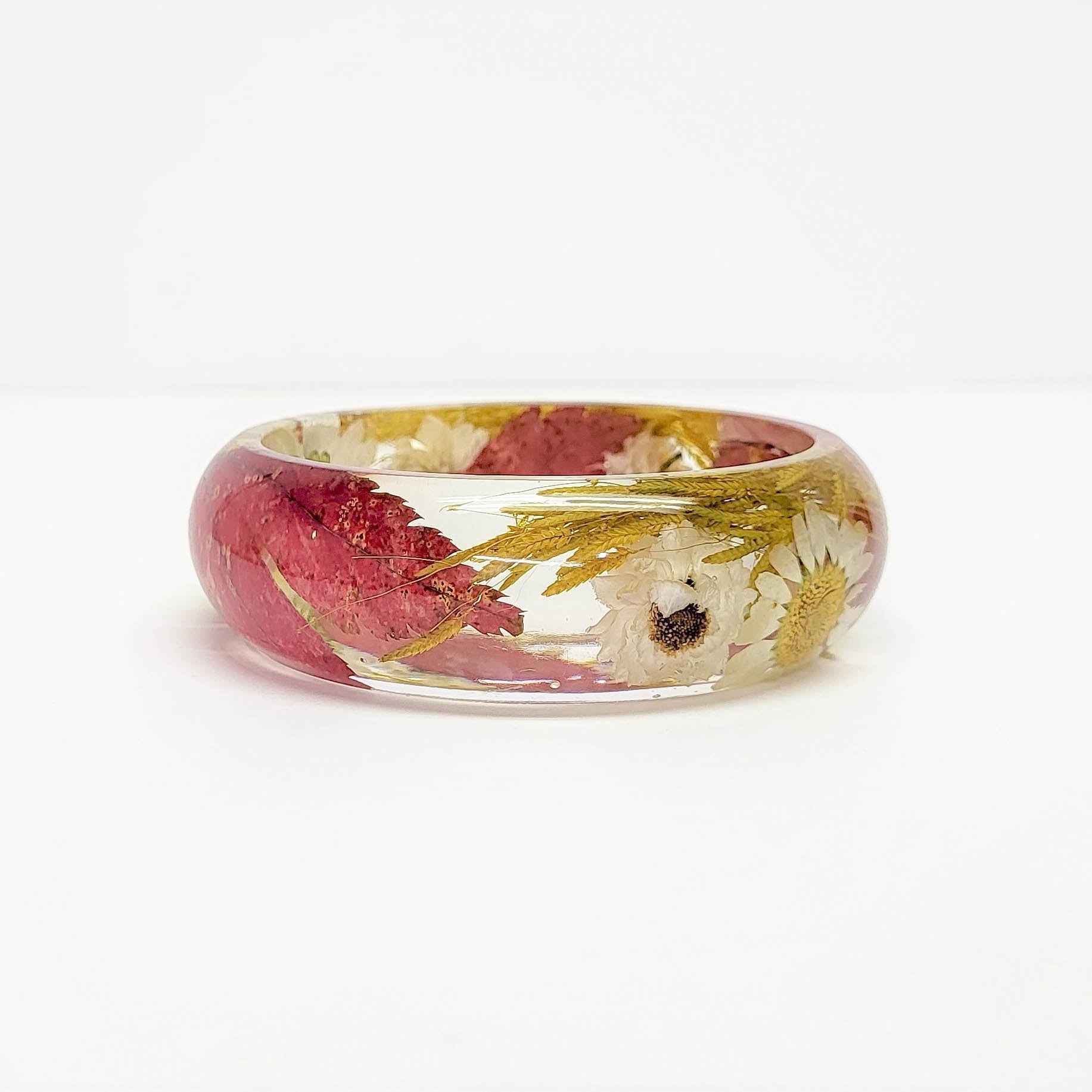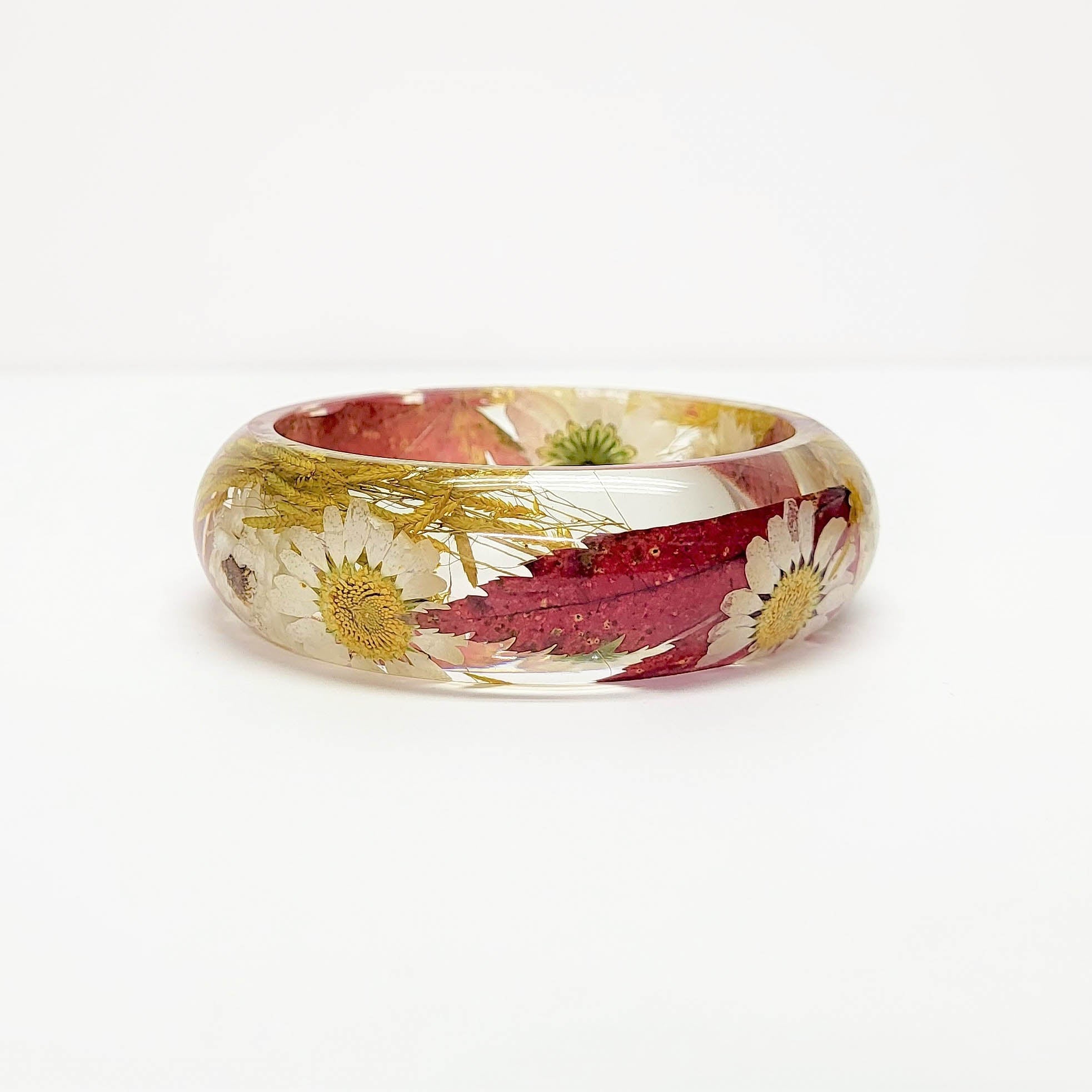 Real flower resin bracelet. This bangle features pressed leaves, grasses and daisy flowers.