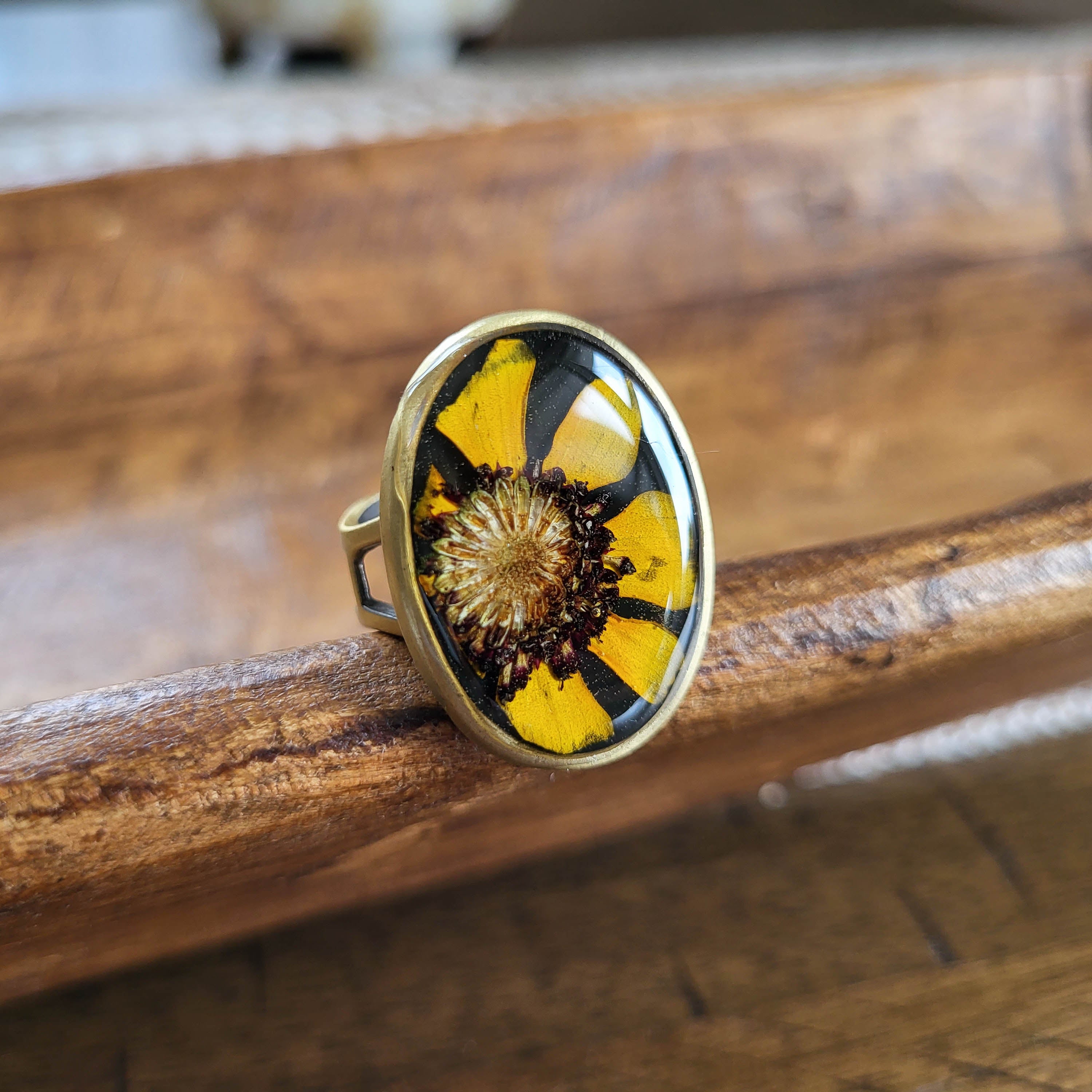 Real pressed flower ring, featuring Black Eyed Susan flower. The ring has an oval shape and is approximately .70″ x .98″(18x25mm.) Brass base.