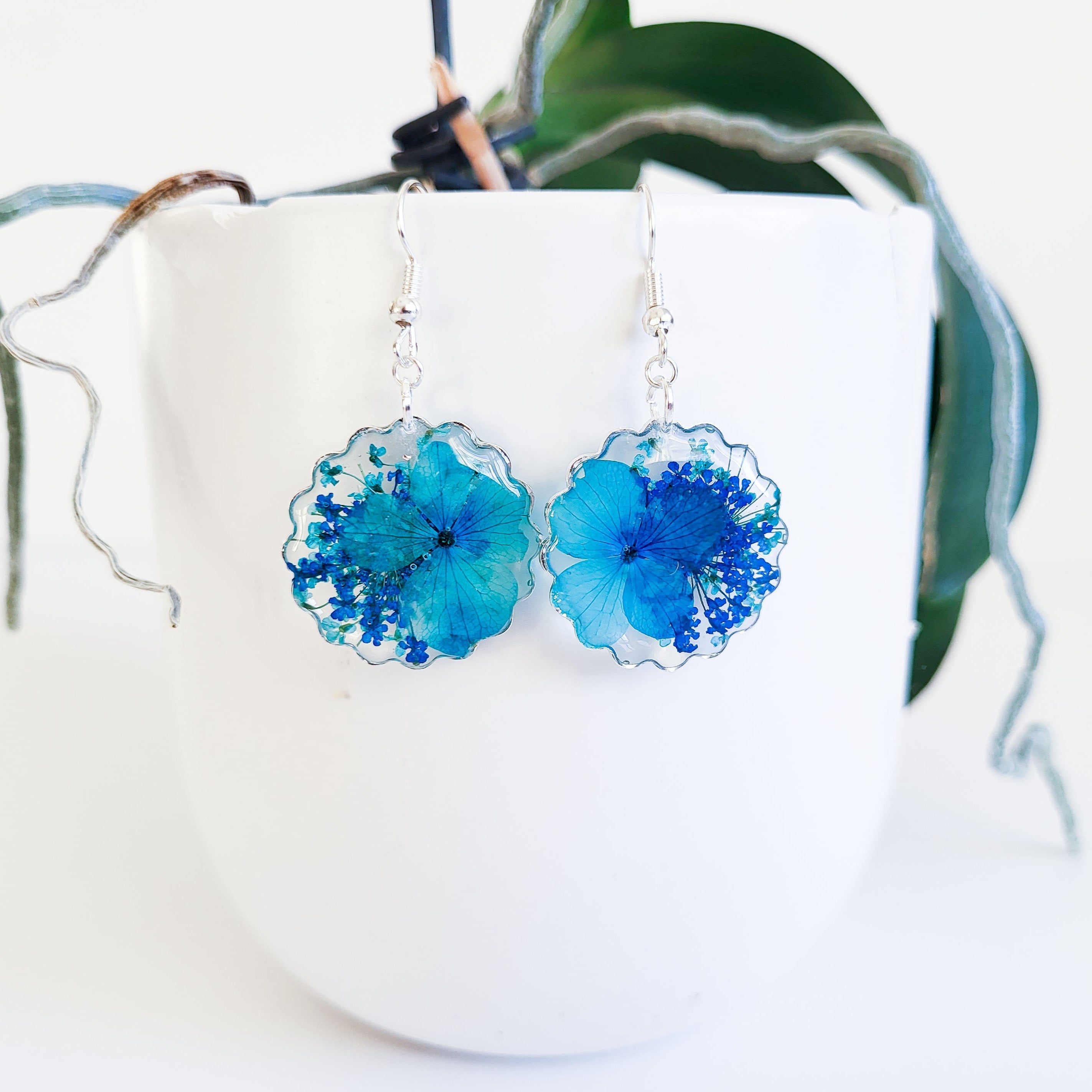 Handmade real pressed flower earrings with blue hydrangeas. Available on gold/silver plated. Earrings measure approximately 1″ with a circular wavy, squiggle rim.