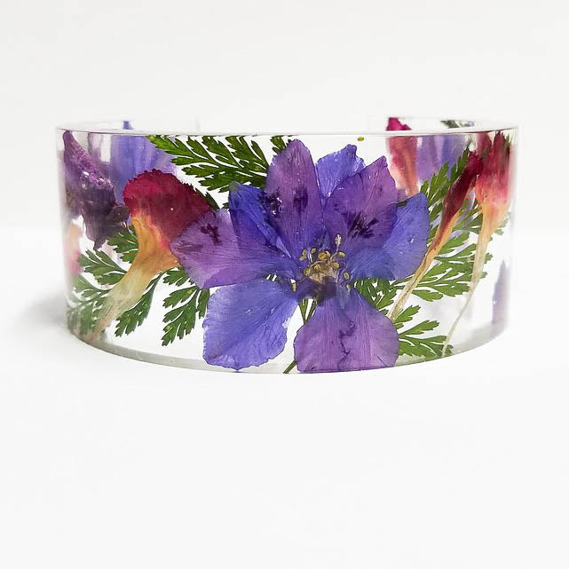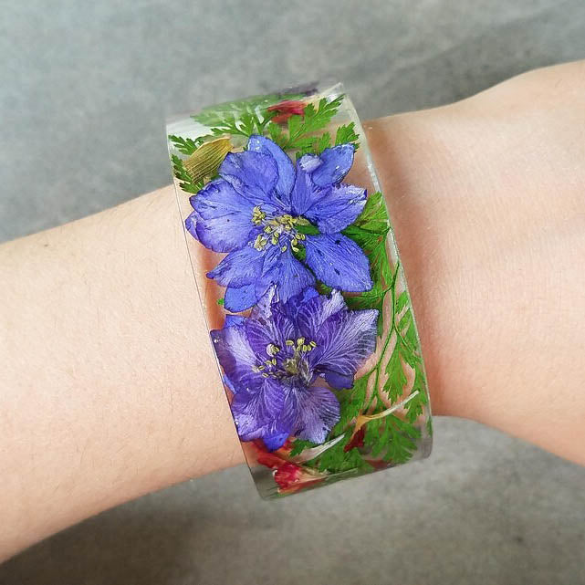 Real pressed flower open cuff resin bracelet, featuring pressed purple larkspur flowers, green ferns, red carnation flower petals and purple hydrangea petals. Purple larkspur symbolizes royalty, spirituality and first love. It is also July birth flower, and makes a great Birthday gift. The bracelet is made out of jeweler’s grade resin. The bracelet is a C shaped open cuff. Measurements are shown on the 6th photo.